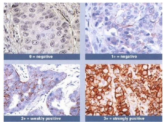 Typical example: Staining of paraffin-embedded human breast cancer tissue sections with different HER2 antibodies: