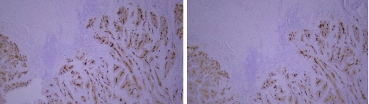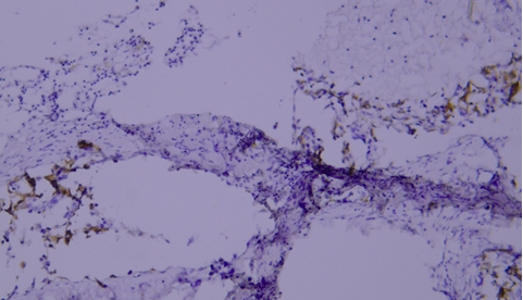 2 Staining of paraffin-embedded breast cancer tissue sections: Mammaglobin staining is positive, but section detachment occurs due to insufficient baking time.