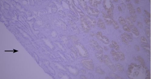 TIMP-1 staining of paraffin-embedded human prostate tissue sections showed false negatives due to tissue drying (indicated by black arrows).