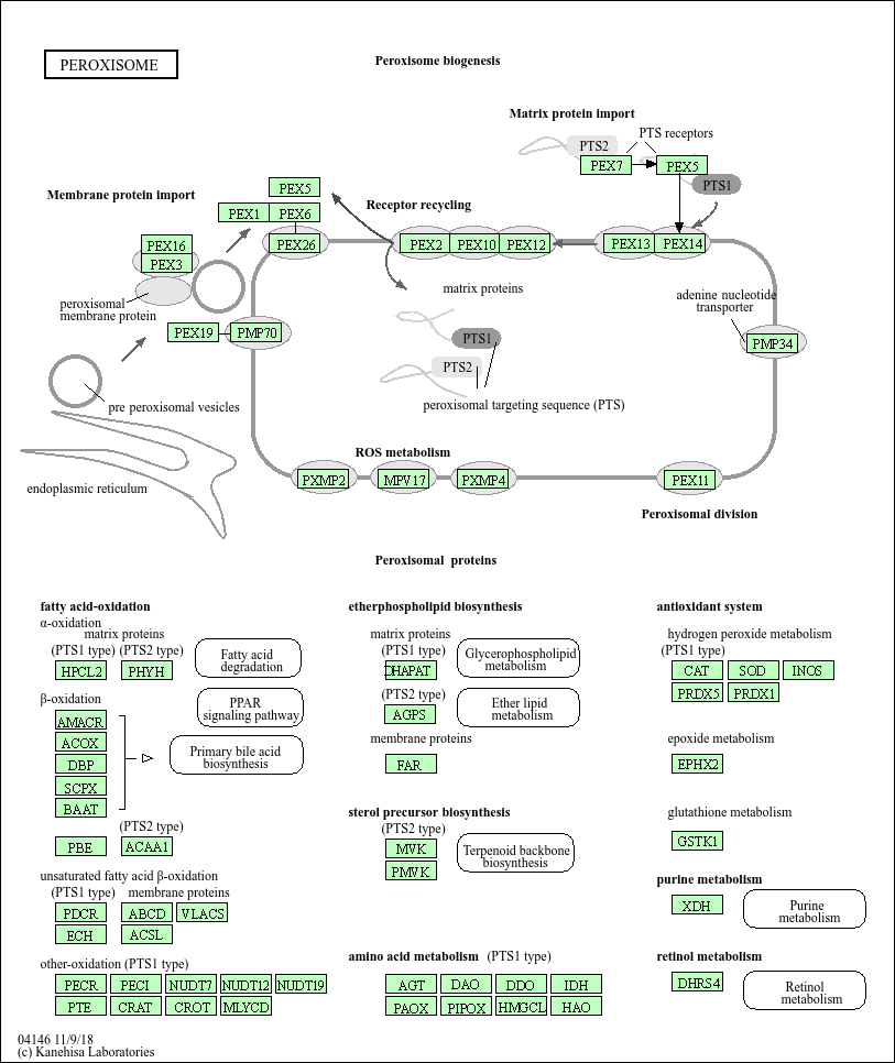 Core key proteins: Catalase (CAT, decomposing H₂O₂), fatty acid β-oxidases (ACOX1, ABCD1, SCPx), peroxisomal biogenesis proteins (PEX3, PEX5, PEX19, regulating membrane assembly and enzyme import), peroxisomal membrane proteins (PMP70, ABCD2), acyl-CoA synthetase (ACS), isoprenoid synthase (FPPS), superoxide dismutase (SOD, synergistic antioxidant).