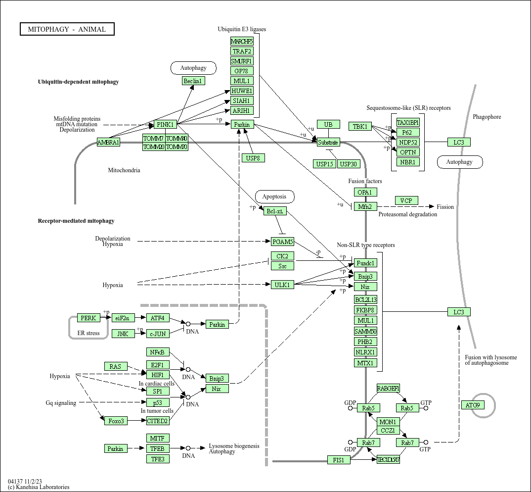 Core of basic research: Deciphers the molecular mechanism by which animal cells selectively recognize and degrade damaged/excessive mitochondria, critical for maintaining mitochondrial homeostasis and avoiding oxidative stress damage. Core regulatory pathways include ubiquitin-dependent and receptor-dependent types: In the ubiquitin-dependent pathway, mitochondrial damage induces ROS release or reduced membrane potential, triggering the recruitment of Parkin (E3 ubiquitin ligase) to the mitochondrial membrane, which ubiquitinates mitochondrial proteins (e.g., TOM20, VDAC1), further recruiting autophagic receptors such as p62/SQSTM1 to mediate autophagosome encapsulation of mitochondria. In the receptor-dependent pathway, mitochondrial membrane receptors (e.g., BNIP3, NIX/BNIP3L) directly bind the autophagy-related protein LC3, initiating mitochondrial encapsulation without ubiquitination. Eventually, mitochondria-encapsulating autophagosomes fuse with lysosomes to degrade mitochondria and recycle nutrients. Research focuses include mitochondrial damage sensing mechanisms, Parkin recruitment and ubiquitination regulation, selective recognition mechanisms of autophagic receptors, cross-talk between mitophagy and apoptosis, and the association of pathway abnormalities with Parkinson’s disease (Parkin mutations) and myocardial ischemia-reperfusion injury.