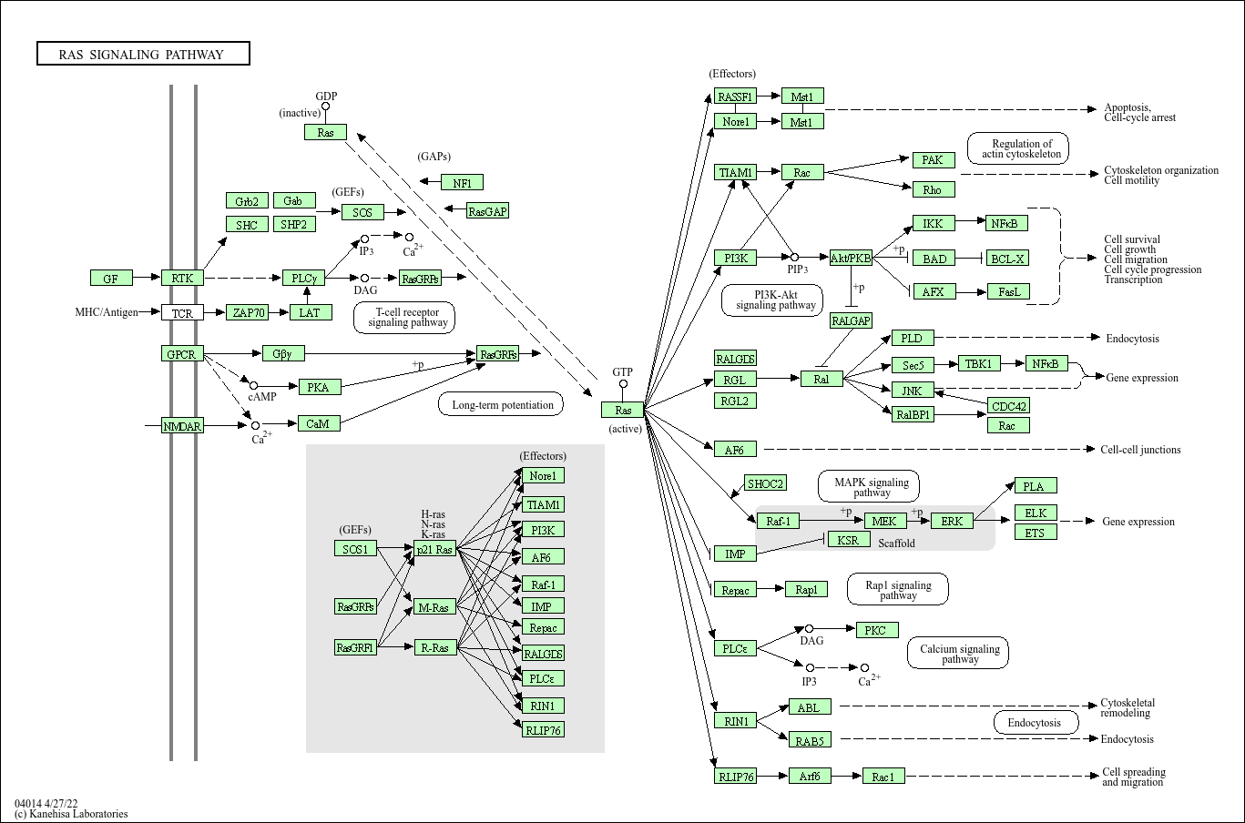 A signal transduction pathway centered on Ras family small GTPases (H-Ras, K-Ras, N-Ras), serving as a key link connecting receptor tyrosine kinases (RTK) to downstream effector pathways. Ras proteins act as signal "switches" by binding to GTP (active state) or GDP (inactive state); GEF (guanine nucleotide exchange factor) promotes the formation of Ras-GTP, while GAP (GTPase-activating protein) promotes GTP hydrolysis to inactivate Ras. Activated Ras recruits downstream kinases (e.g., Raf, PI3K), activating pathways such as MAPK and PI3K-Akt to regulate cell proliferation, differentiation, migration, and survival. Ras gene mutations (e.g., K-Ras G12D) can lead to its sustained activation, driving tumorigenesis, and it is one of the most common driver mutations in tumors such as pancreatic cancer, colorectal cancer, and lung cancer. Drugs targeting mutant Ras have gradually entered clinical practice.