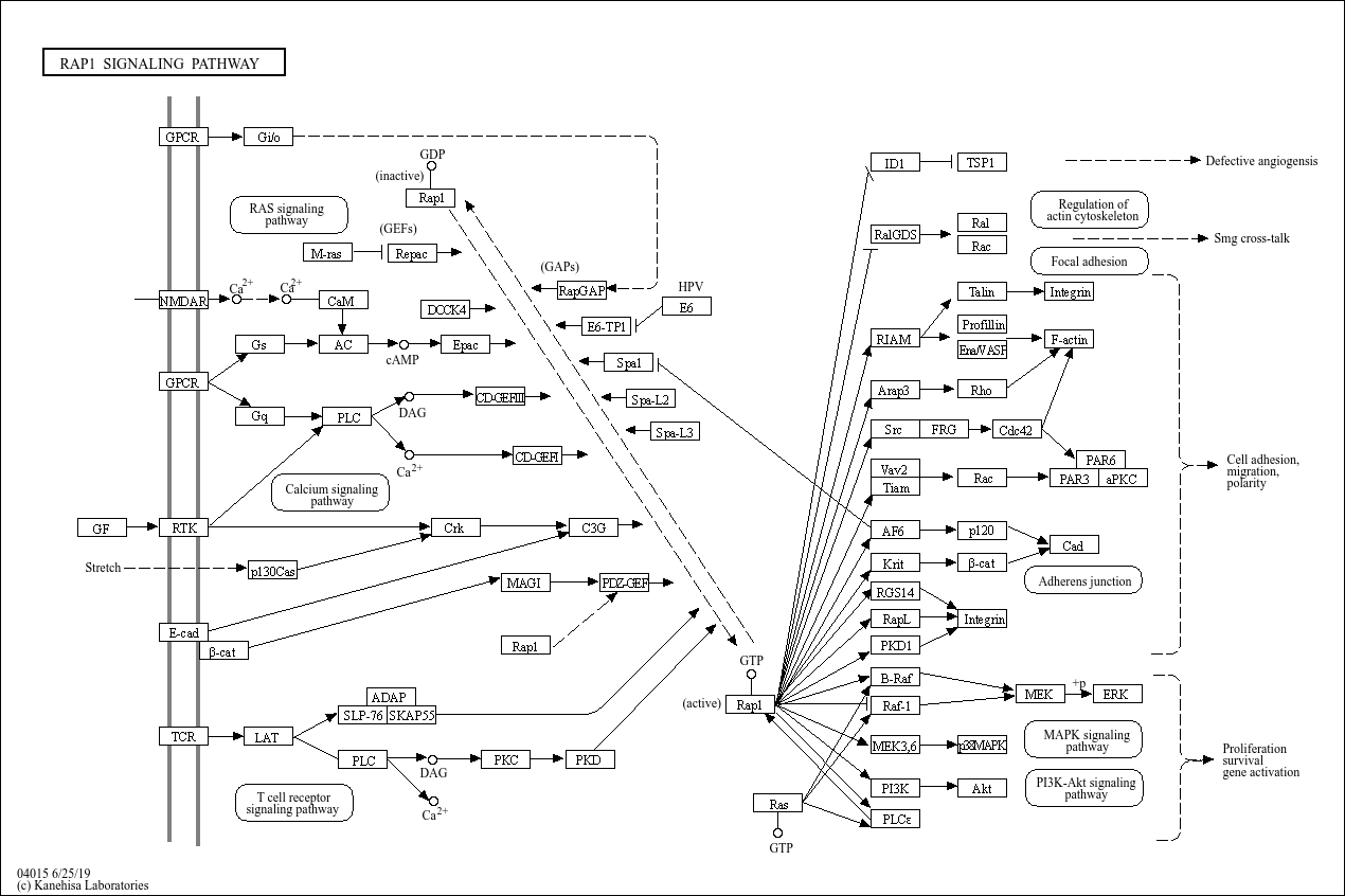 Key regulatory molecules: Rap1A/B, Raf, MEK, ERK, PI3K, Cadherin, Integrin.