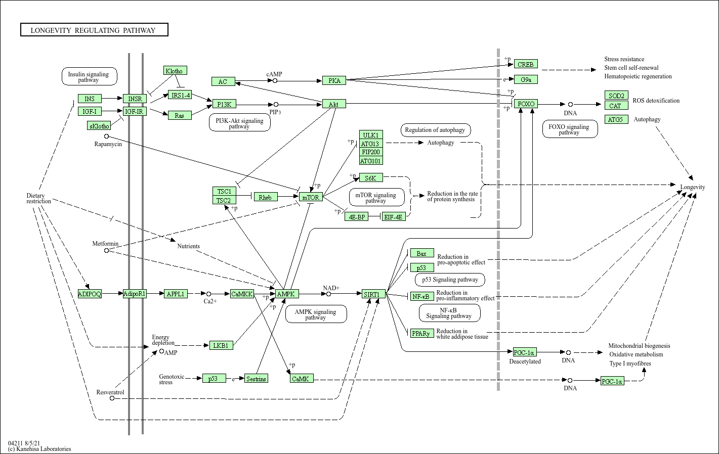 Core of basic research: Deciphers conserved molecular mechanisms regulating organismal lifespan, with core pathways including insulin/IGF-1, AMPK, mTOR, and Sirtuin pathways that maintain aging balance via cross-regulation. Excessive insulin/IGF-1 signaling shortens lifespan, while downstream transcription factors FOXO1/3/4 activate antioxidant, DNA repair, and autophagy-related genes to extend lifespan. As an energy-sensing kinase, AMPK is activated by energy restriction, low glucose, or exercise, inhibiting mTOR to promote autophagy and metabolic reprogramming, reducing cell damage. Hyperactivated mTOR accelerates aging by promoting anabolism and proliferation; mTOR inhibition extends lifespan across species. The NAD⁺-dependent Sirtuin family (SIRT1-SIRT7) participates in chromatin silencing, DNA repair, and metabolic regulation. SIRT1 activation enhances cellular stress resistance via deacetylating p53 and FOXO. Research focuses on cross-regulatory networks, energy restriction-longevity associations, oxidative stress-cell aging links, pathway abnormalities in age-related diseases (Alzheimer’s, diabetes, tumors), and development of intervention targets (e.g., mTOR inhibitors, Sirtuin activators).