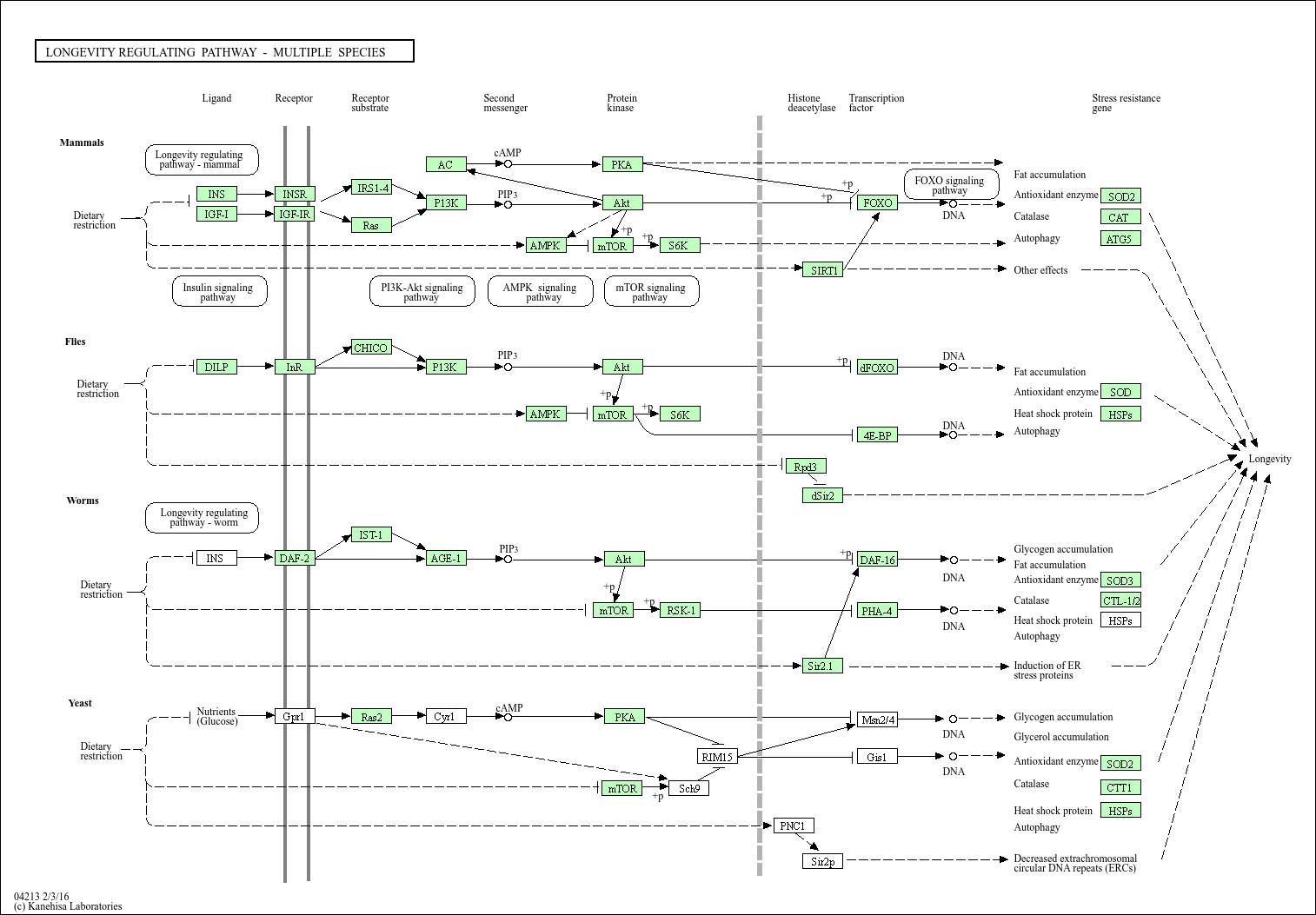 Core of basic research: Explores conserved longevity mechanisms across yeast, nematodes, Drosophila, and mammals, revealing evolutionarily shared aging logic. In nematodes, DAF-2 (insulin receptor homolog) mutations activate DAF-16 (FOXO homolog), upregulating stress resistance genes to extend lifespan. In yeast, SIR2 (SIRT1 homolog) extends lifespan via chromatin silencing and DNA repair. In Drosophila, inhibiting TOR or insulin/IGF-1 signaling significantly prolongs lifespan. In mammals, these pathways are conserved, and FOXO3 polymorphisms are closely linked to human longevity. Research focuses on conservation/species-specificity of longevity pathways, functional conservation of key genes (FOXO, SIRT1, TOR), environmental regulation (nutrition, temperature, exercise), and translational application of cross-species mechanisms.