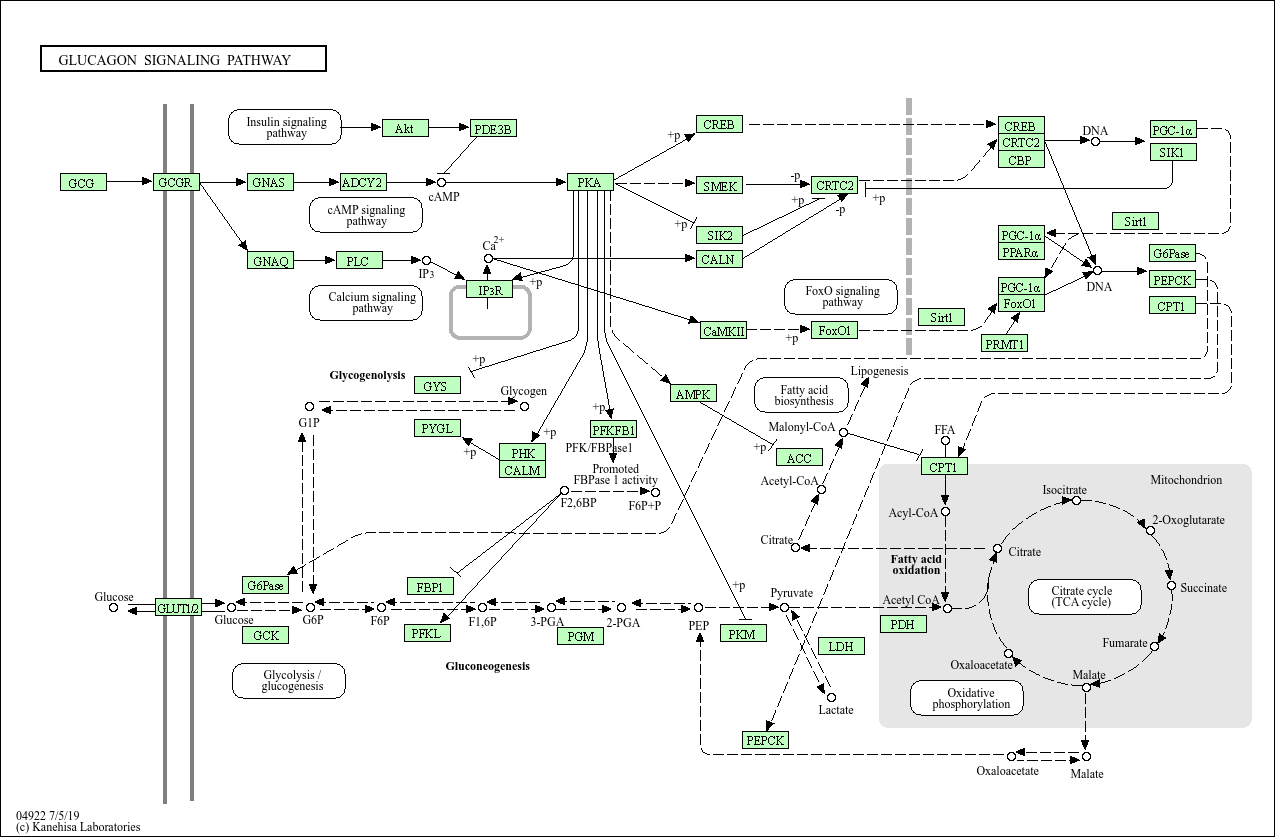 Core of basic research: An antagonistic pathway of insulin, deciphering the molecular mechanisms by which glucagon regulates blood glucose elevation and maintains energy homeostasis, serving as a key defense against hypoglycemia. Glucagon is secreted by pancreatic α cells, binding to the glucagon receptor (GCGR, a G protein-coupled receptor) on target organ cells (liver, kidney). It activates Gs proteins to promote AC-mediated cAMP production; cAMP activates PKA, which phosphorylates downstream substrates: activating glycogen phosphorylase (GP) to promote hepatic glycogenolysis, inhibiting glycogen synthase (GS) to reduce glycogen storage, and activating gluconeogenic key enzymes (PEPCK, G6Pase) to promote glucose production from non-carbohydrates. Additionally, glucagon activates the MAPK pathway to regulate hepatocyte proliferation and metabolic reprogramming. Research focuses on the glucose-dependent regulation of glucagon secretion, the balance mechanism between this pathway and the insulin pathway, and pathway abnormalities associated with diabetes (excessive glucagon secretion in type 1 diabetes, glucagon resistance in type 2 diabetes).