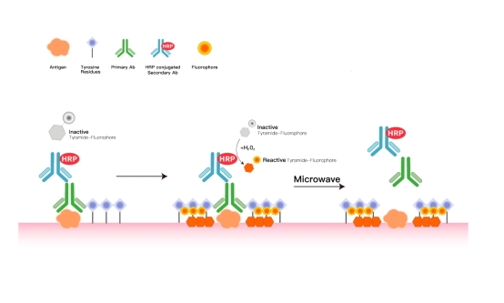 Its principle relies on TSA (Tyramide Signal Amplification) technology—an enzyme-catalyzed signal amplification method for immunoassays. The core mechanism involves horseradish peroxidase (HRP) catalyzing the deposition of tyramide derivatives, enabling efficient signal enhancement of target molecules. Through a cyclic staining strategy, it overcomes the target number limitation of traditional IHC/IF, achieving accurate, efficient, and multiplex labeling of multiple target proteins in cell/tissue samples.