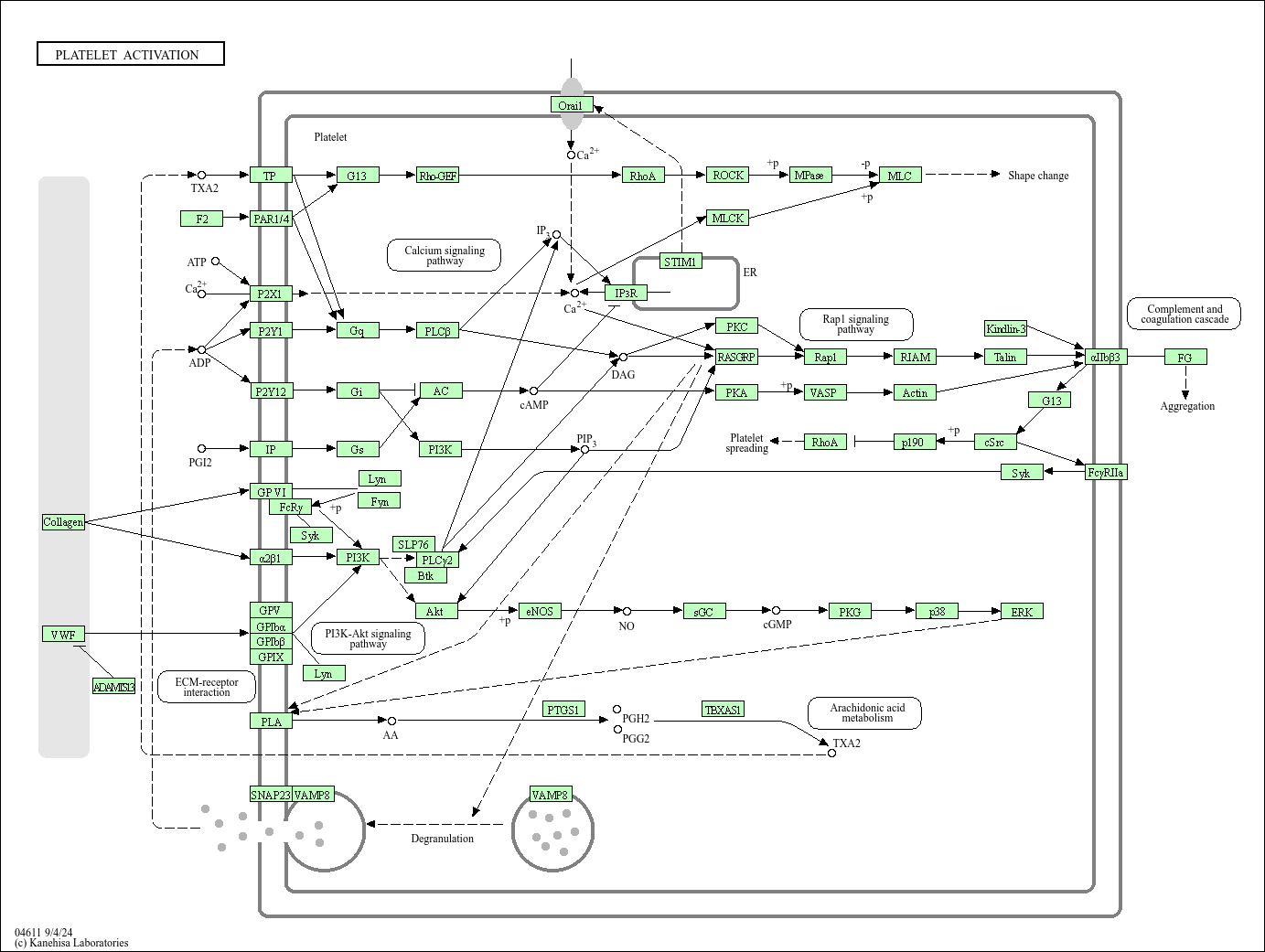 Core of basic research: Deciphers the three-step molecular mechanism ("adhesion-aggregation-degranulation") of platelet-initiated hemostasis and thrombosis after vascular injury. Exposed subendothelial collagen post-injury binds platelets via GPVI receptors and GPIb-IX-V complexes (with vWF), completing adhesion. Adhesion triggers platelet activation, increasing intracellular calcium concentration and inducing release of granular contents (e.g., ADP, thromboxane A2/TXA2). These released substances act as secondary activation signals, binding to platelet surface P2Y12 (ADP receptor) and TP (TXA2 receptor) to amplify activation, inducing conformational changes and activation of GPⅡb/Ⅲa receptors. Activated GPⅡb/Ⅲa binds fibrinogen, mediating platelet cross-linking and aggregation to form white thrombi. Research focuses on the signal transduction cascade of platelet activation (PLC-γ2, PI3K-Akt pathways), conformational regulation of GPⅡb/Ⅲa activation, targets of antiplatelet drugs (aspirin, clopidogrel), and molecular triggers of excessive platelet activation in thrombotic diseases (myocardial infarction, cerebral infarction).