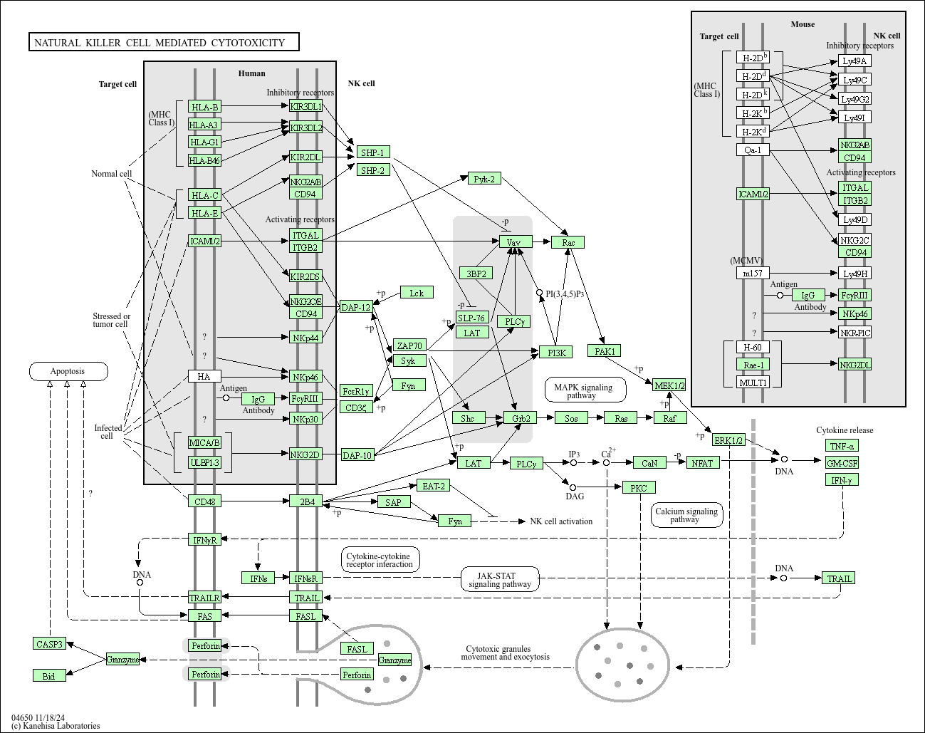 Core key proteins: NK cell receptors (NKG2D, KIR family, NKp30/NKp46), Perforin, Granzyme B, Fas/FasL, TNF-α/TNFR1, caspase-3/8 (apoptosis execution enzymes), MICA/B (stress molecules), IFN-γ (enhances killing activity), Eomes/T-bet (NK cell function regulatory transcription factors).