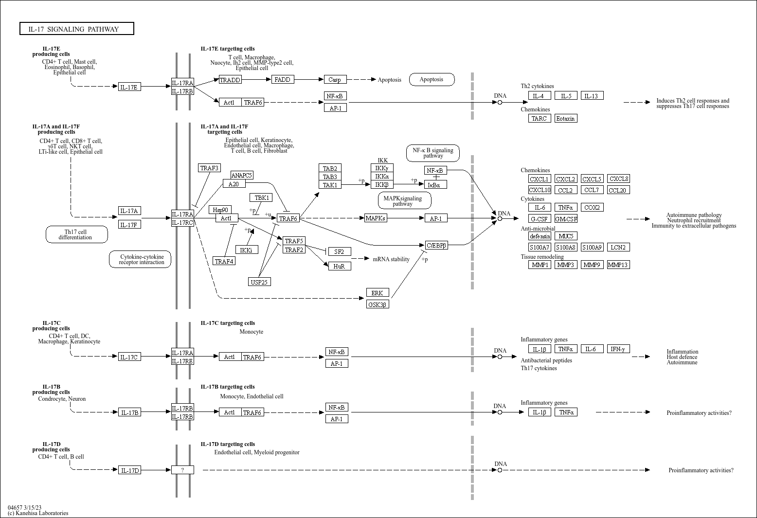 ore of basic research: It focuses on the inflammation activation mechanism after IL-17 family cytokines (mainly IL-17A/F) bind to receptors, which is widely involved in the pathological processes of infectious diseases, autoimmune diseases, and tumors. After IL-17A/F binds to the receptor complex composed of IL-17RA/RC, it recruits TRAF6 via the SEFIR domain in the cytoplasmic segment of the receptor, activating the NF-κB, MAPK (p38/ERK), and STAT3 pathways. This promotes the secretion of inflammatory factors such as IL-6, TNF-α, and CXCL8, as well as matrix metalloproteinases (MMPs), recruiting neutrophils to infiltrate inflammatory sites and enhancing tissue inflammatory responses. Research focuses include the assembly mechanism of the IL-17 receptor complex, response differences of different cell types (epithelial cells, fibroblasts, immune cells) to IL-17, synergistic effects between this pathway and other inflammatory pathways (e.g., TNF-α pathway), and regulatory mechanisms of excessive pathway activation in autoimmune diseases (e.g., rheumatoid arthritis, psoriasis).