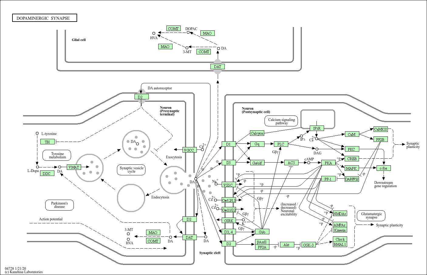 Core key proteins: Dopamine (DA), dopamine receptors (D1-D5 subtypes), tyrosine hydroxylase (TH, rate-limiting enzyme for DA synthesis), AADC (aromatic L-amino acid decarboxylase), dopamine transporter (DAT), Synaptotagmin (mediating exocytosis), Gs/Gi proteins (receptor-coupled proteins), AC (adenylyl cyclase), cAMP, PKA (protein kinase A), DARPP-32 (dopamine- and cAMP-regulated phosphoprotein), MAPK (ERK, involved in gene transcription), synaptic vesicles (VAMP/SNAP-25/Syntaxin, mediating membrane fusion).