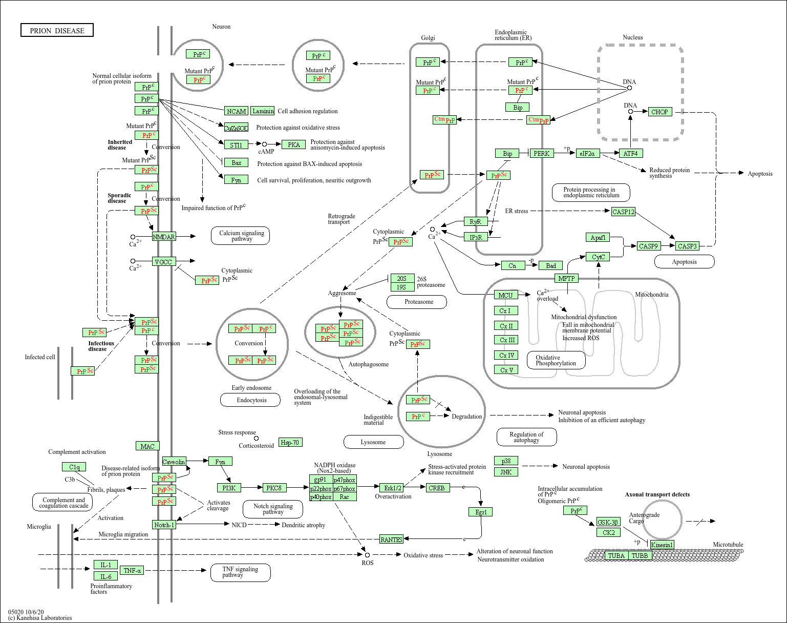 Core key proteins: PrPc (normal prion protein susceptible to conformational change), PrPsc (abnormal prion protein with infectivity and toxicity), Hsp70 (heat shock protein involved in protein folding), Ubiquitin/proteasome-related proteins (involved in protein degradation).