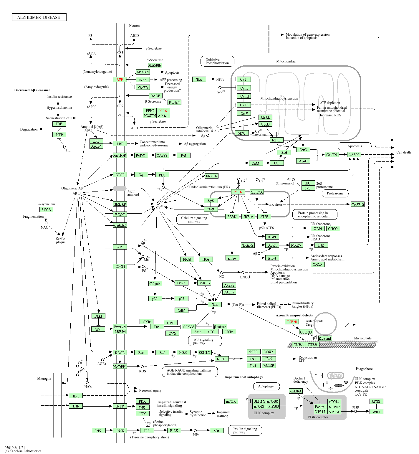 Core key proteins: Aβ (β-amyloid protein forming toxic aggregates upon deposition), Tau protein (forms tangles upon hyperphosphorylation), APP (amyloid precursor protein processed to produce Aβ), PS1/PS2 (presenilins involved in APP cleavage), BACE1 (β-secretase initiating APP cleavage), IDE (insulin-degrading enzyme degrading Aβ), ApoE (affects Aβ clearance, ε4 subtype increases risk).