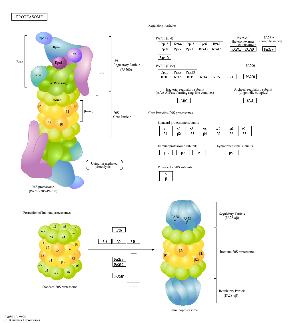Core of basic research: Focuses on the molecular mechanism by which the 26S proteasome specifically degrades ubiquitinated proteins, a key process for regulating cellular protein homeostasis. The 26S proteasome consists of a 19S regulatory particle and a 20S catalytic particle: The 19S particle recognizes and binds to target proteins labeled with polyubiquitin chains, unfolds the protein conformation, and transports it to the 20S catalytic particle. The 20S particle contains trypsin-like, chymotrypsin-like, and caspase-like active sites, degrading proteins into short peptides (subsequently hydrolyzed into amino acids for recycling). Degradation substrates include misfolded proteins, cell cycle regulatory proteins, transcription factors, and oncoproteins, participating in cell cycle progression, signal transduction, and apoptosis regulation. Research focuses include the substrate specificity of proteasomal degradation, the synergistic effect between the ubiquitin-proteasome system and other degradation pathways (e.g., autophagy), and the association of pathway abnormalities with tumors (proteasome inhibitors used for tumor treatment) and inflammation.