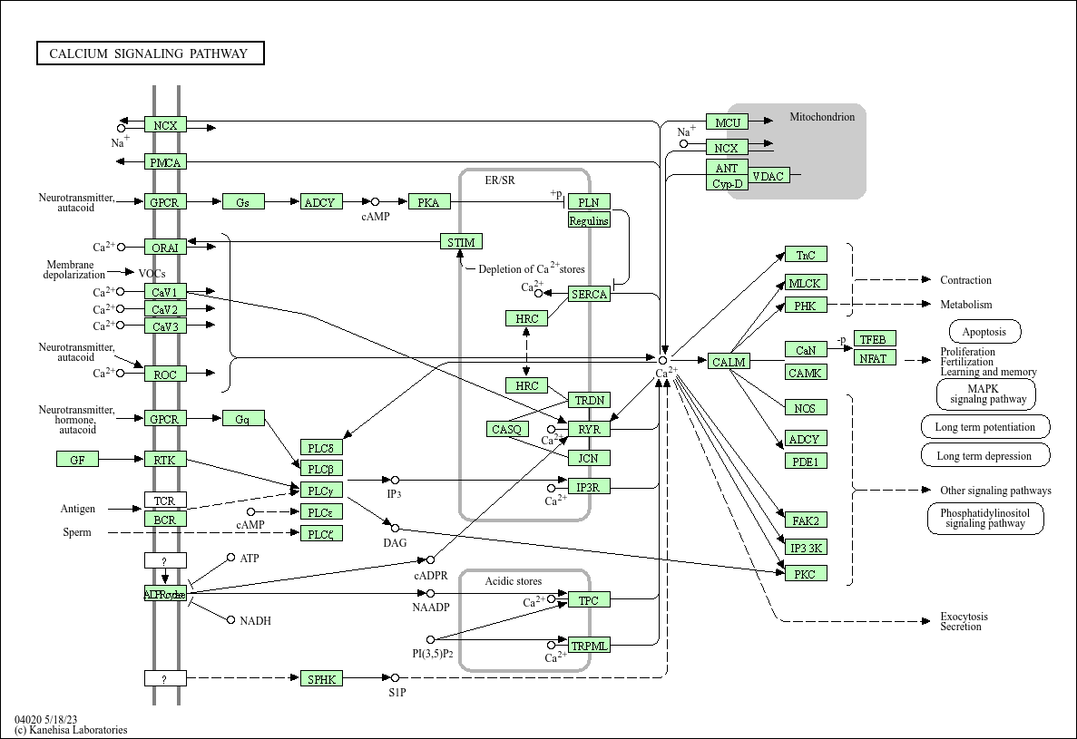 A signal transduction system with Ca²⁺ as the second messenger, one of the most widespread signal pathways in cells. The intracellular Ca²⁺ concentration is strictly regulated by the cell membrane (voltage-gated calcium channels, ligand-gated calcium channels, Ca²⁺-ATPase) and organelles (endoplasmic reticulum/sarcoplasmic reticulum RyR, IP3R channels, SERCA pumps), forming spatiotemporally specific Ca²⁺ signals (e.g., calcium sparks, calcium oscillations). Ca²⁺ binds to calmodulin (CaM) and activates downstream effector molecules (e.g., CaMKⅡ, PKC), regulating various cell functions: metabolic regulation (glycogenolysis, fat synthesis), muscle contraction, neural conduction (neurotransmitter release), cell apoptosis, and gene expression. Pathway dysfunction is associated with various diseases such as arrhythmia (calcium channel abnormalities), neurodegenerative diseases (e.g., calcium homeostasis imbalance in Alzheimer's disease), epilepsy, and osteoporosis.