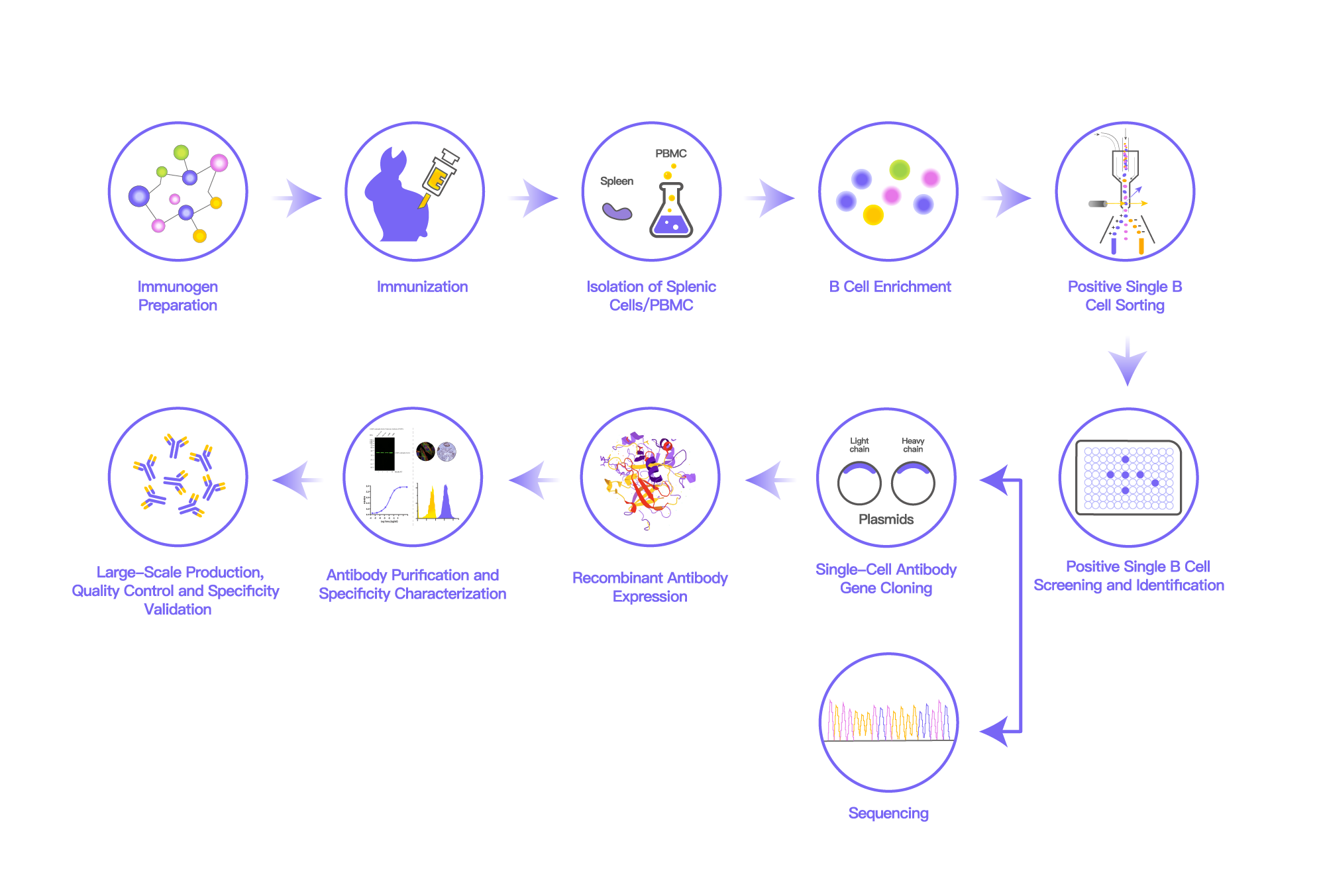 Individual sorted B cells are cultured separately. The specificity of antibodies secreted by single B cells is comprehensively validated using multiple established techniques, including:SPR (Surface Plasmon Resonance)、ELISA (Enzyme-Linked Immunosorbent Assay)、WB (Western Blot)、IF (Immunofluorescence)、IHC (Immunohistochemistry)