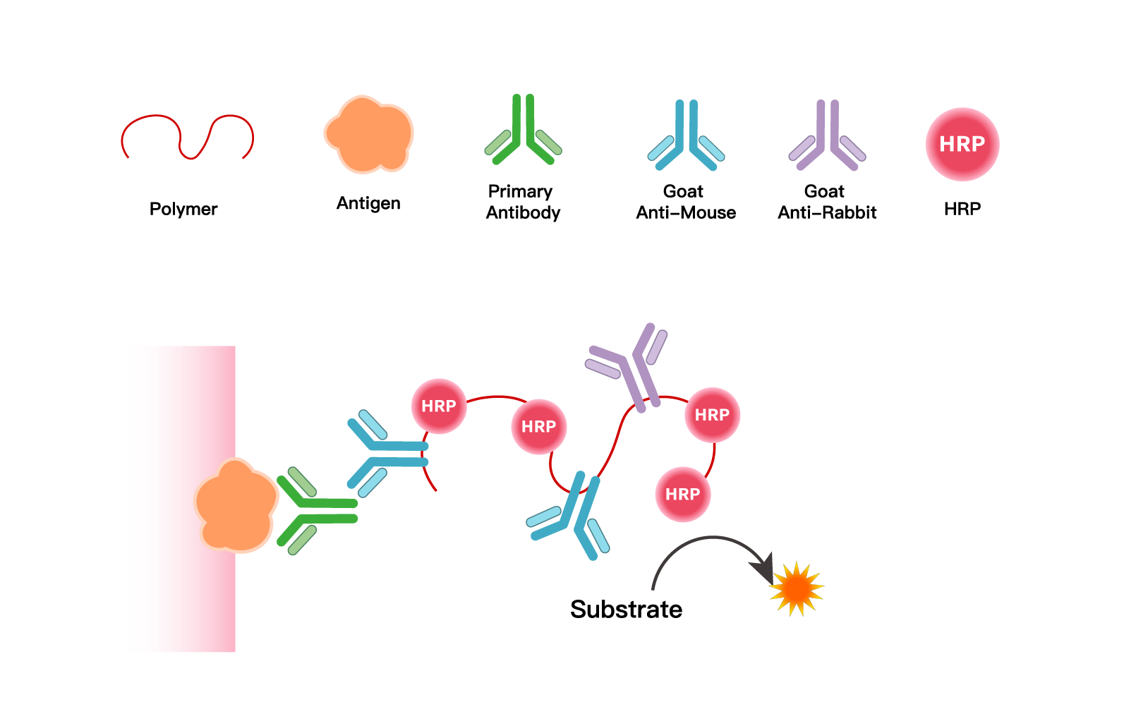 Using polymers as carriers, their multi-site properties enable simultaneous conjugation of multiple peroxidase molecules and secondary antibody molecules targeting mouse/rabbit immunoglobulins on a single carrier. This creates an integrated IHC chromogenic system combining "signal amplification + specific binding," ultimately delivering precise, bright, and clear staining signals to ensure accurate localization and interpretation of target antigens in pathological sections.
