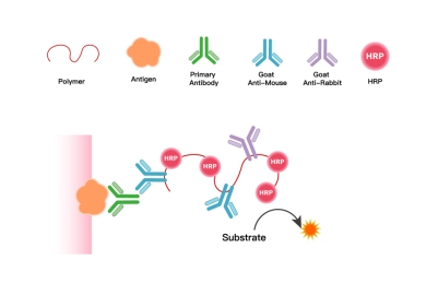 Using polymers as carriers, their multi-site properties enable simultaneous conjugation of multiple peroxidase molecules and secondary antibody molecules targeting mouse/rabbit immunoglobulins on a single carrier. This creates an integrated IHC chromogenic system combining "signal amplification + specific binding," ultimately delivering precise, bright, and clear staining signals to ensure accurate localization and interpretation of target antigens in pathological sections.