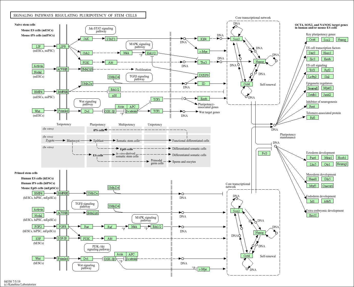 Core of basic research: Clarifies the signaling network that maintains the self-renewal and pluripotent differentiation potential of embryonic stem cells (ESCs) and induced pluripotent stem cells (iPSCs), a core focus of stem cell biology and regenerative medicine. Four core regulatory pathways are involved: The Wnt pathway (activates β-Catenin nuclear translocation to regulate the expression of pluripotency genes such as Oct4 and Sox2); the PI3K-Akt pathway (inhibits apoptosis and promotes stem cell self-renewal); the JAK-STAT3 pathway (LIF binds to its receptor to activate STAT3, maintaining ESC pluripotency); the BMP pathway (activates Smad signaling to synergize with other pathways in regulating stem cell fate). These pathways maintain the balance between stem cell self-renewal and differentiation by regulating the core pluripotency transcription factor network (Oct4, Sox2, Nanog, Klf4, c-Myc). Research focuses include the synergistic and antagonistic regulatory logic of each pathway, the target gene network of pluripotency transcription factors, the stabilizing effect of epigenetic modifications (DNA methylation, histone modification) on pluripotency, and the association of pathway abnormalities with stem cell differentiation disorders (e.g., cancer stem cell formation) and regenerative medicine applications (optimization of iPSC induction efficiency).