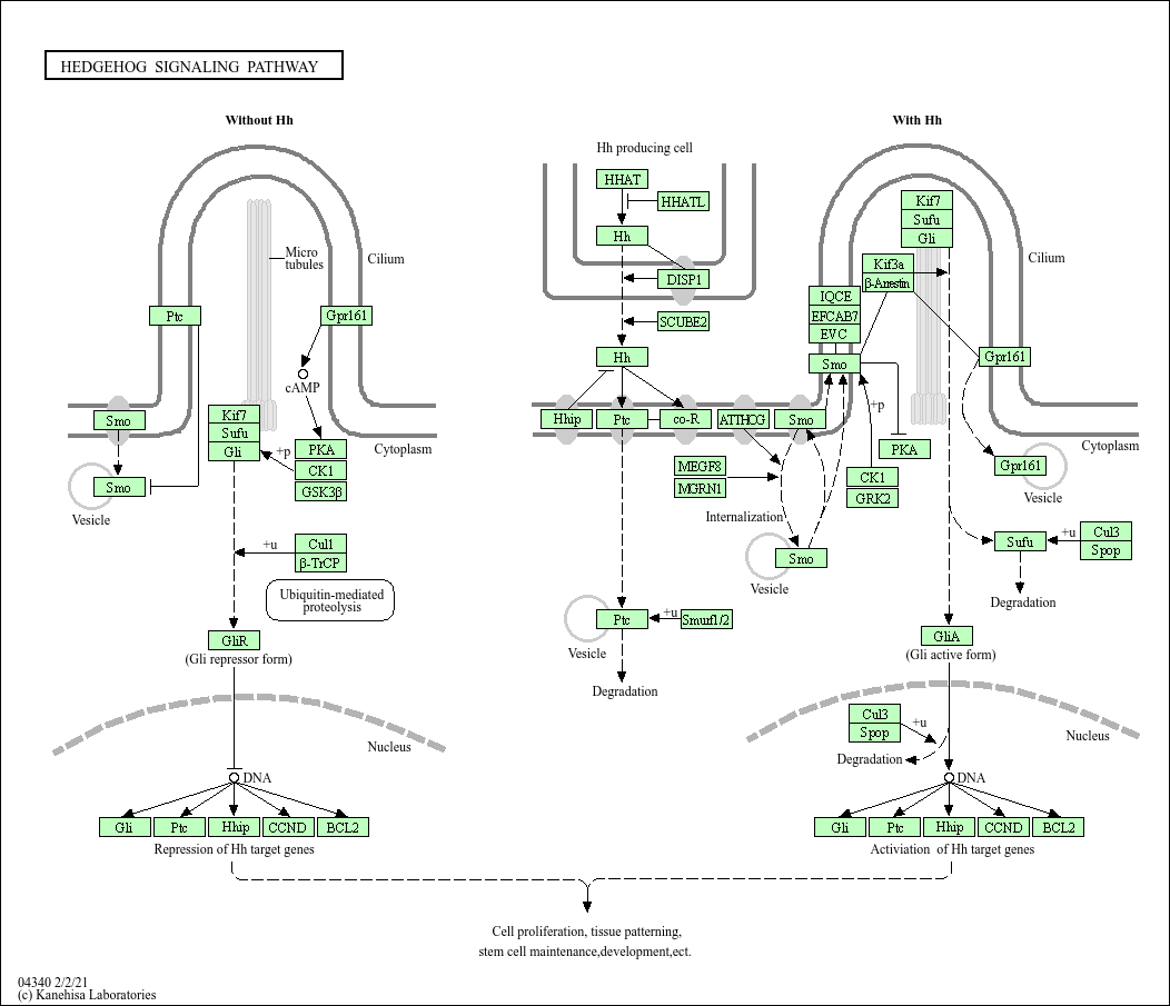 An evolutionarily highly conserved developmental regulatory pathway, its core molecules include Hh ligands (Sonic Hh, Indian Hh, Desert Hh), receptor Ptch1, co-receptor Smo, and Gli family transcription factors (Gli1-3). In the resting state, Ptch1 inhibits Smo activity; binding of Hh ligands to Ptch1 relieves this inhibition, allowing Smo to enter cilia and activate Gli transcription factors to regulate target gene expression. Its core functions include organ morphogenesis during embryonic development (e.g., limb development, neural tube formation), maintenance of adult stem cell self-renewal, and tissue regeneration (e.g., liver repair). Abnormal activation of the pathway is associated with the occurrence of various tumors, such as basal cell carcinoma (almost all have pathway mutations), medulloblastoma, and pancreatic cancer. Inhibitors targeting Smo have been used in clinical treatment.